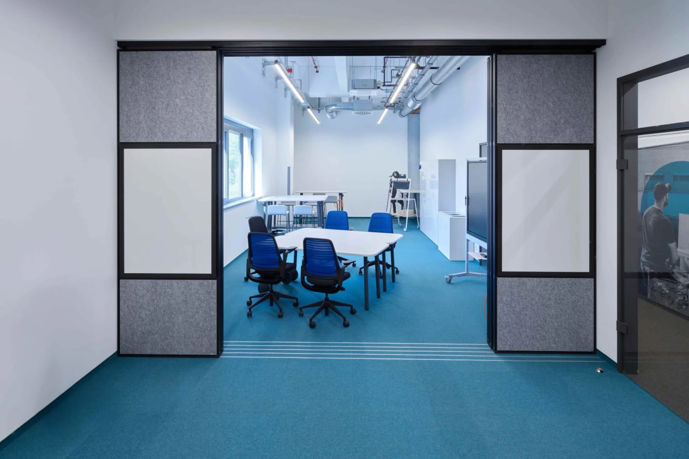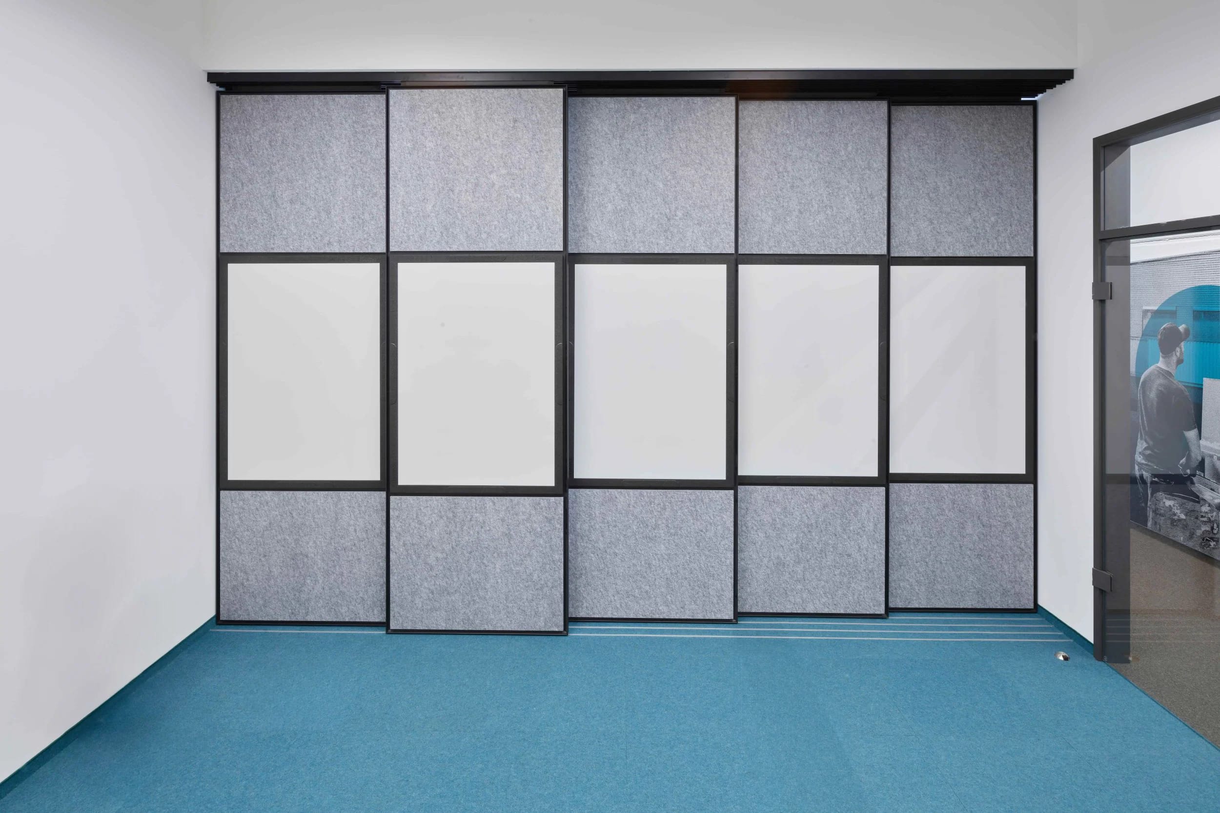 Dank der flexiblen flomo wall lässt sich der Raum nun situativ anpassen und bei Bedarf unterteilen, sodass auch kleinere Teams eine angenehme, überschaubare Arbeitsatmosphäre vorfinden und sich nicht verloren fühlen. Besonders überzeugend für den Kunden war neben der Flexibilität und Akustik auch die Möglichkeit, Whiteboards direkt in das System zu integrieren, um kreative und kollaborative Prozesse bestmöglich zu unterstützen.