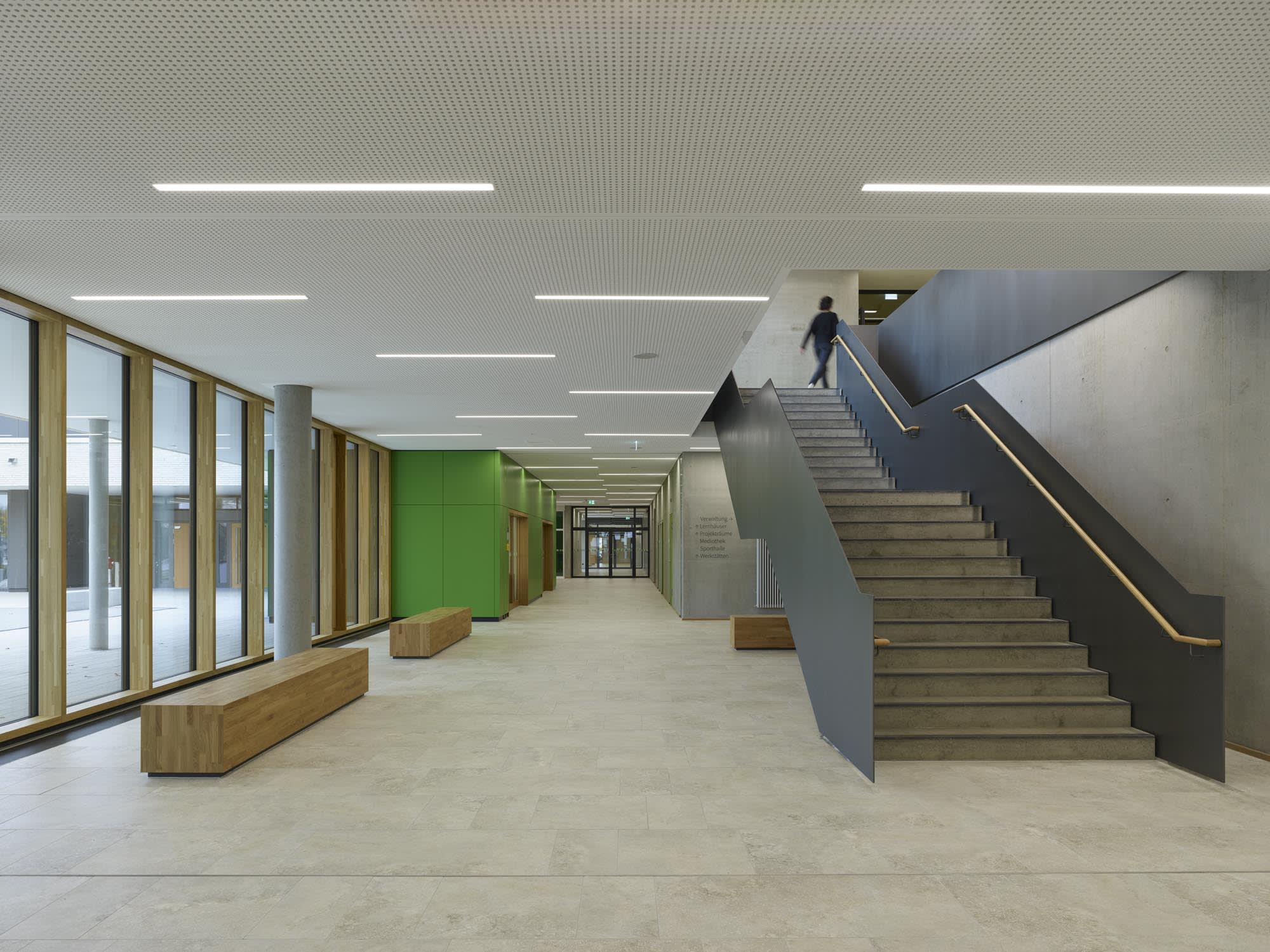 In der Aula wurden akustisch wirksamen Lamellenpaneele als Wandverkleidung eingesetzt. Im Foyer kamen grüne A1-Brandschutzplatten zum Einsatz. Auch die von Westermann ausgestatteten Teeküchen für Lehrkräfte setzen auf grüne Akzente, etwa bei den Arbeitsplatten oder den Rückwänden, die als Spritzschutz fungieren. Analog dazu arbeitet der zentrale Hebefaltladen, dessen Front sich für die Essensausgabe auffaltet, um dann wieder flächenbündig mit der Wand zu verschmelzen, mit grünen Verkleidungen. Im Untergeschoss baute Westermann die Umkleidekabinen aus und bestückte sie mit Bänken und Garderobenleisten.