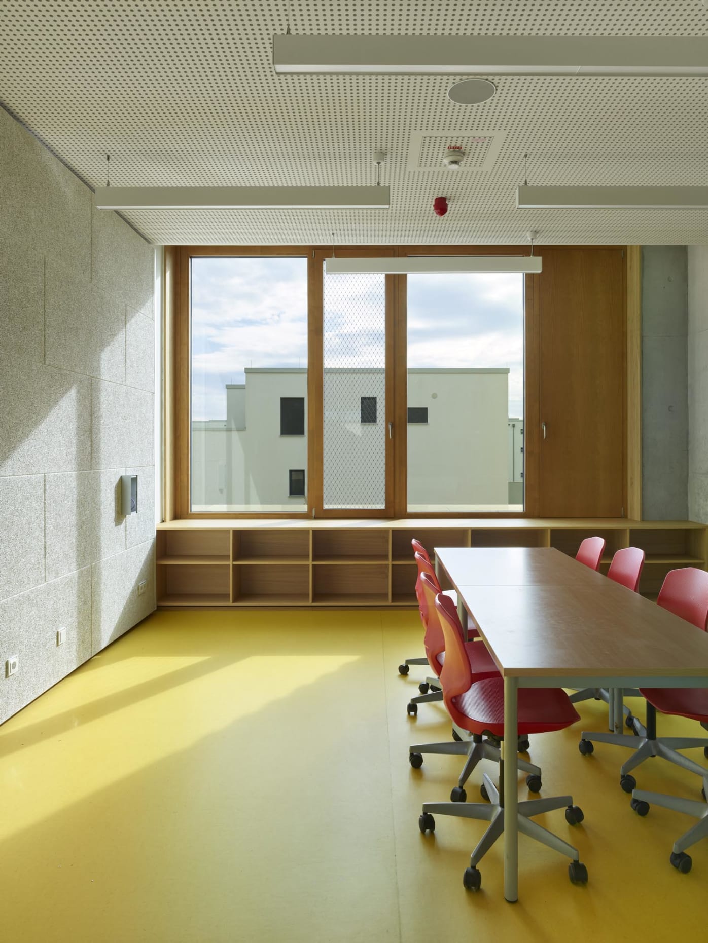 In 40 Klassen- und Gemeinschaftsräumen, sowie 17 Büroräumen der Schulleitung und Lehrerschaft setzte Westermann vierseitige Fensterlaibungen ein, insgesamt etwa 1.200 laufende Meter, sowie Brüstungsregale vor beziehungsweise unter die Fenster. Die den Fassadenseiten gegenüberliegenden Wände wurden mit Einbauschränken versehen, die Stauraum bieten und Waschbecken aufnehmen, aber auch die technischen Gebäudeinstallationen bergen. Hier sind die Platten weiß beschichtet und nehmen die Eiche in ihren Kanten wieder auf.