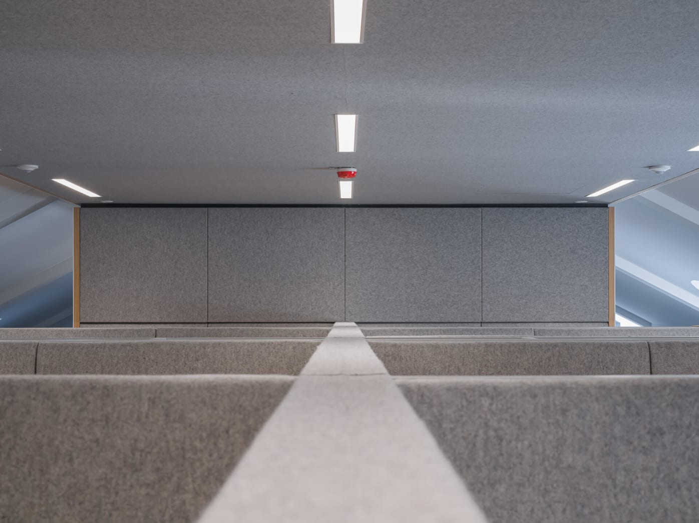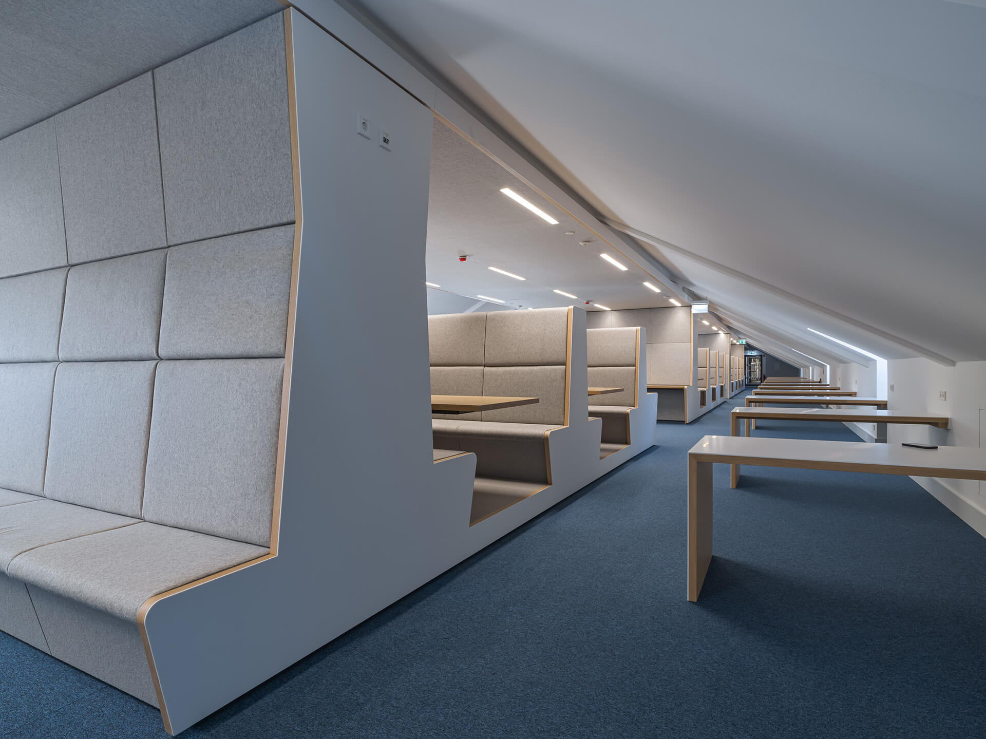 Aber nicht nur das: Auch die Polsterungen bei den Wandverkleidungen und Sitzgruppen wurden von Westermann professionell umgesetzt. Hochwertige Filzmaterialien und spezielle Polsterungen sorgen für eine verbesserte Raumakustik, indem sie den Lärmpegel effektiv reduzieren. Dadurch können sich Studierende und Lehrende besser konzentrieren und ungestört kommunizieren.