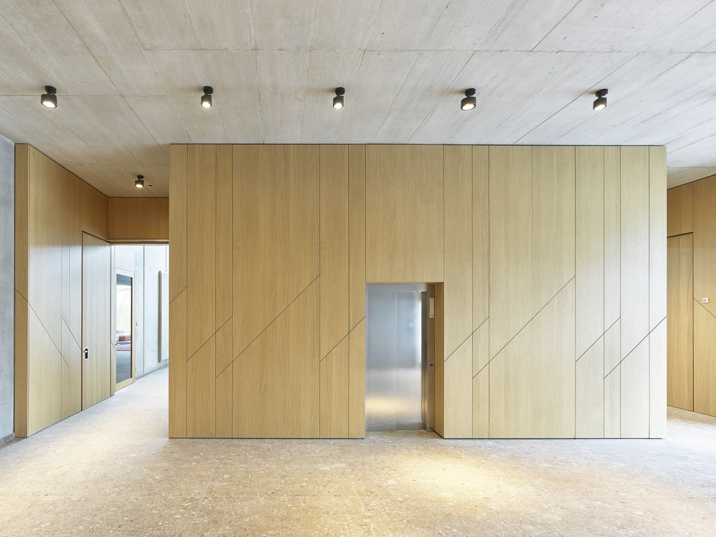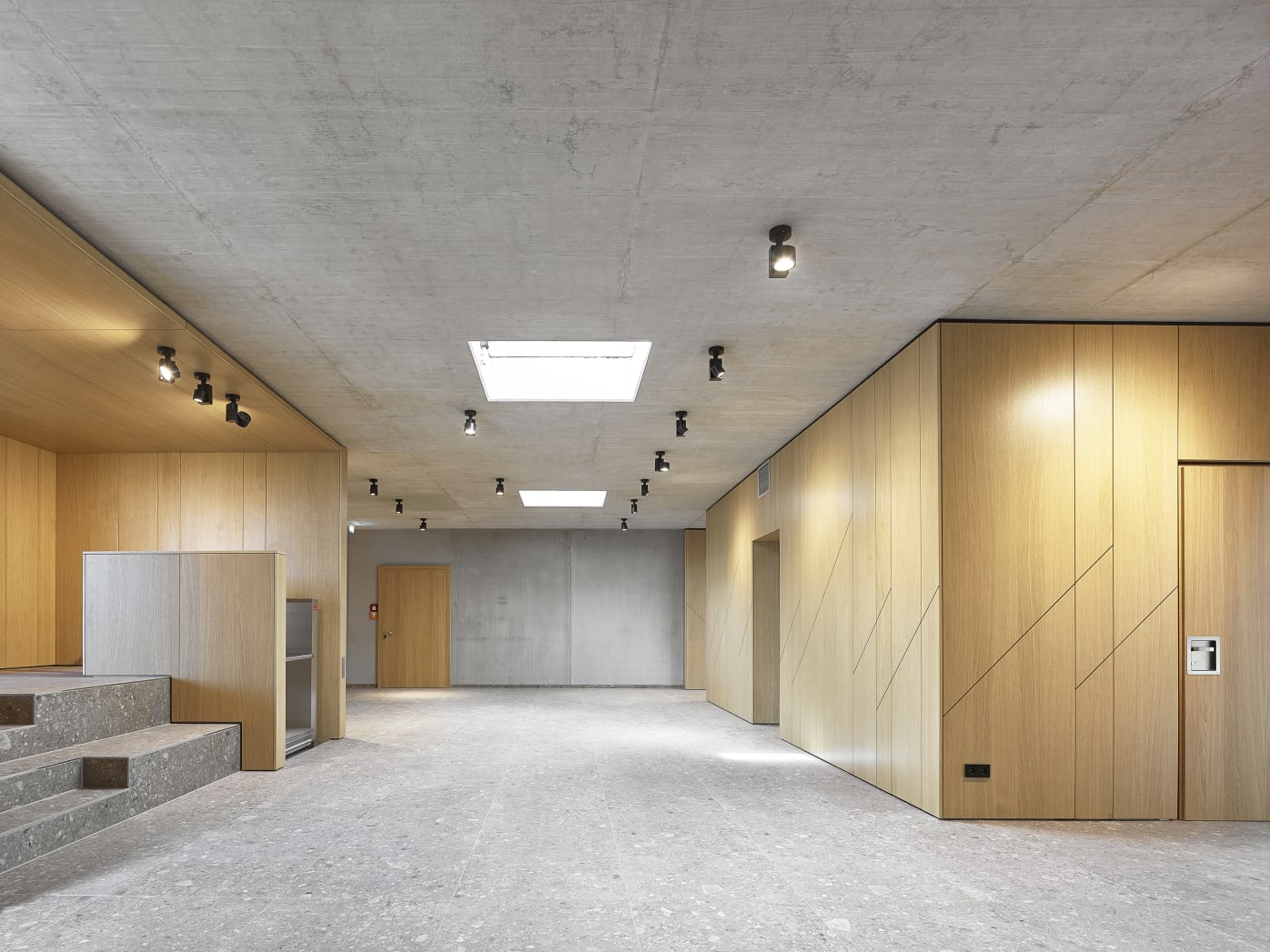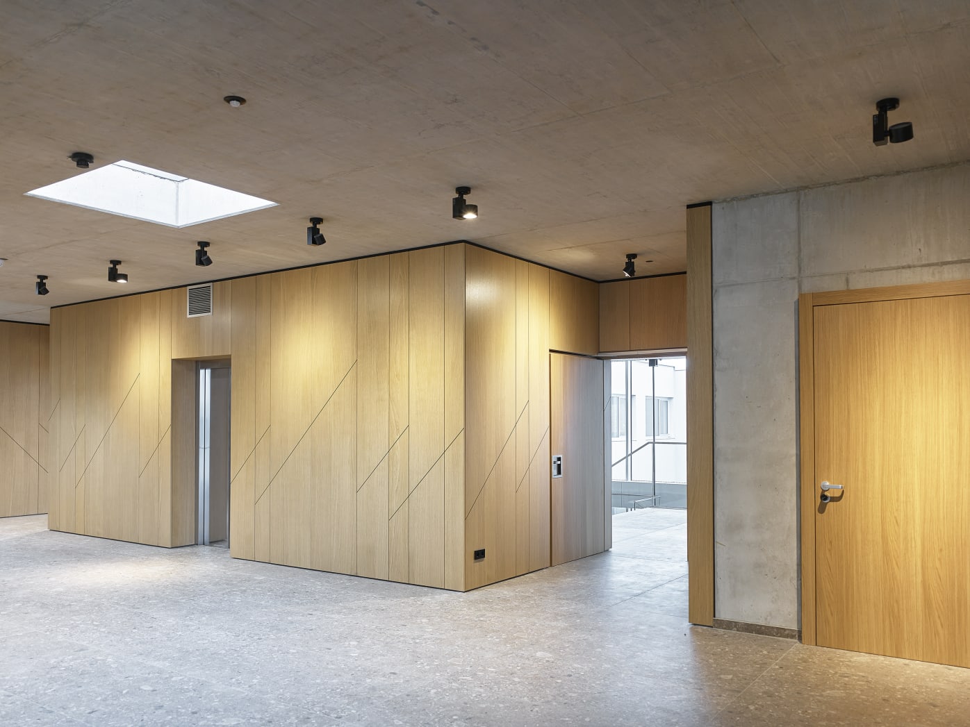 Beim Innenausbau haben wir mit flächenbündig integrierten Brandschutztüren und geometrisch abgestimmten Wandpaneelen ein harmonisches Gesamtbild geschaffen, ohne dabei die Funktionalität zu beeinträchtigen. Optische Highlights sind die diagonalen Zierstreifen, die die Wandverkleidungen akzentuieren und dem Raum eine dynamische Note verleihen. Wir sind stolz darauf, Teil dieses inspirierenden Projekts zu sein und möchten uns bei allen Beteiligten für die großartige Zusammenarbeit bedanken.