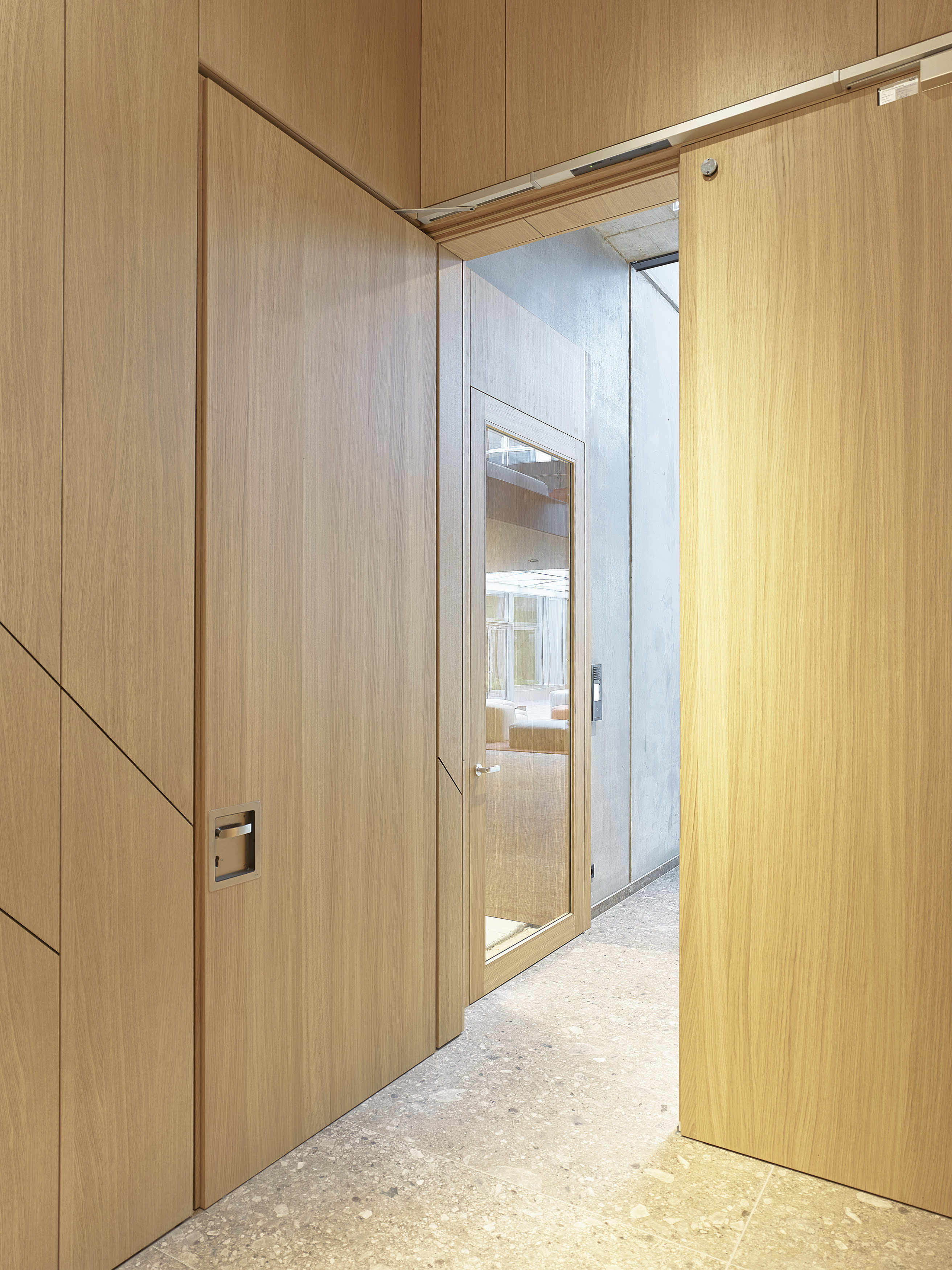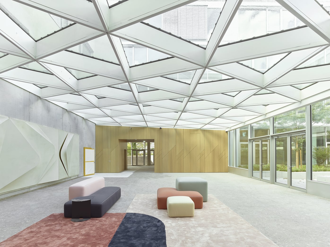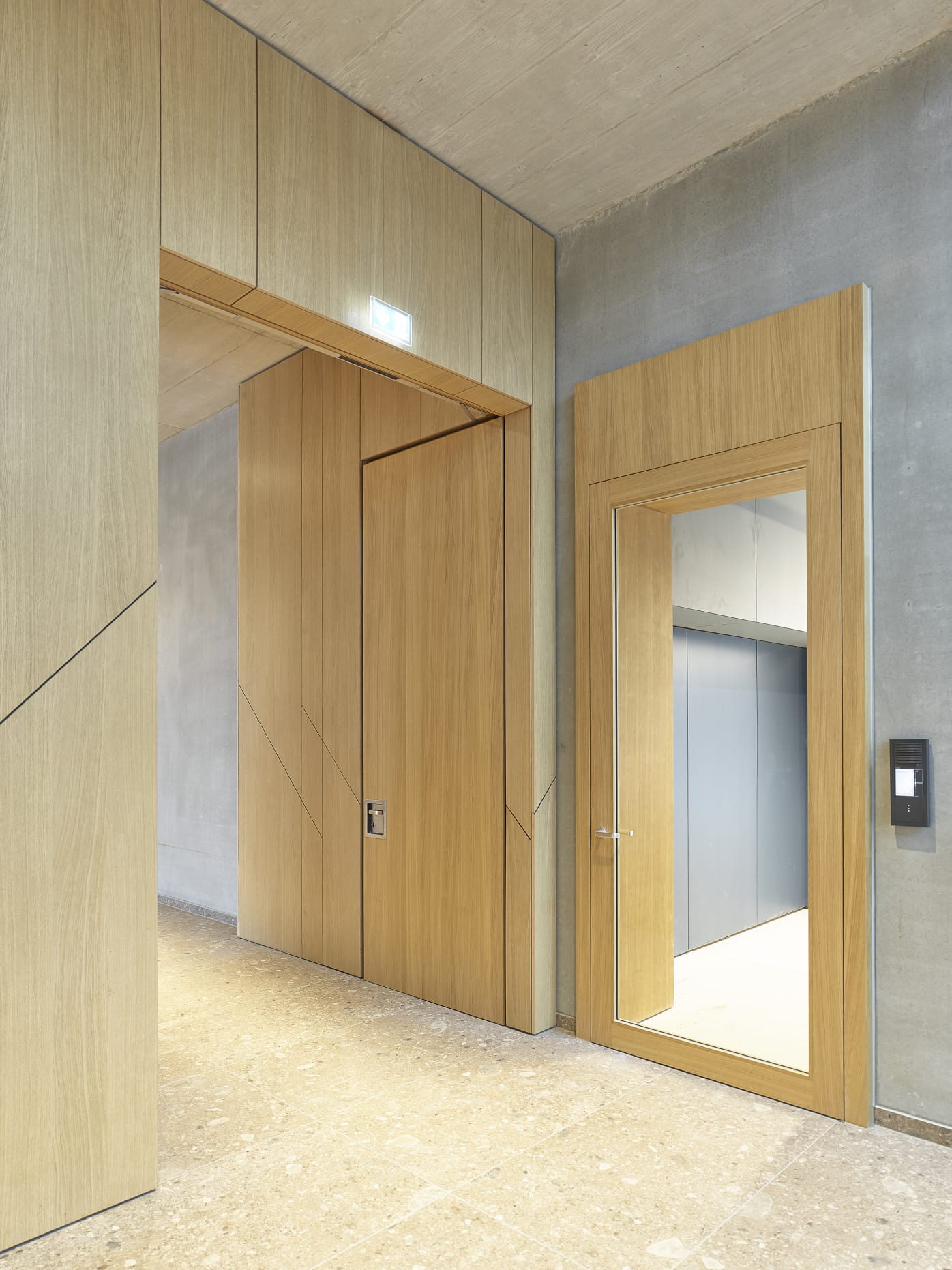 Beim Innenausbau haben wir mit flächenbündig integrierten Brandschutztüren und geometrisch abgestimmten Wandpaneelen ein harmonisches Gesamtbild geschaffen, ohne dabei die Funktionalität zu beeinträchtigen. Optische Highlights sind die diagonalen Zierstreifen, die die Wandverkleidungen akzentuieren und dem Raum eine dynamische Note verleihen. Wir sind stolz darauf, Teil dieses inspirierenden Projekts zu sein und möchten uns bei allen Beteiligten für die großartige Zusammenarbeit bedanken.