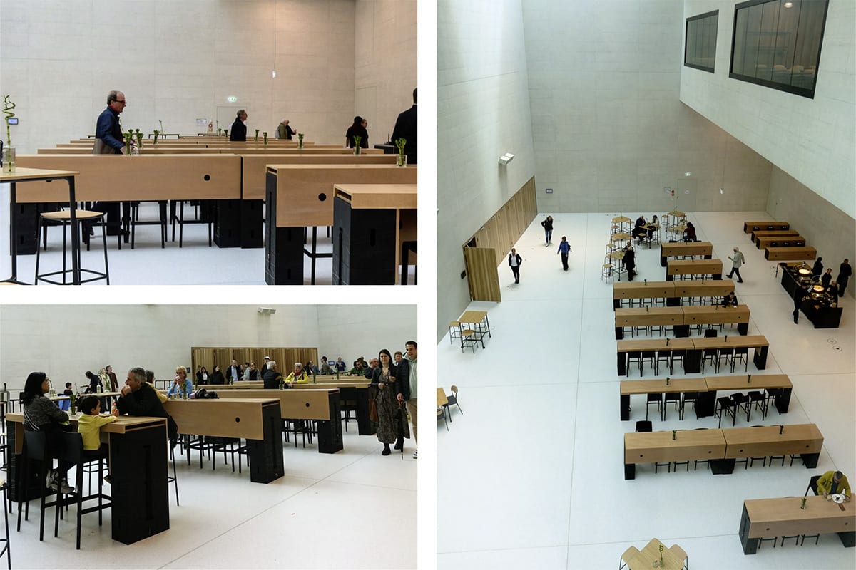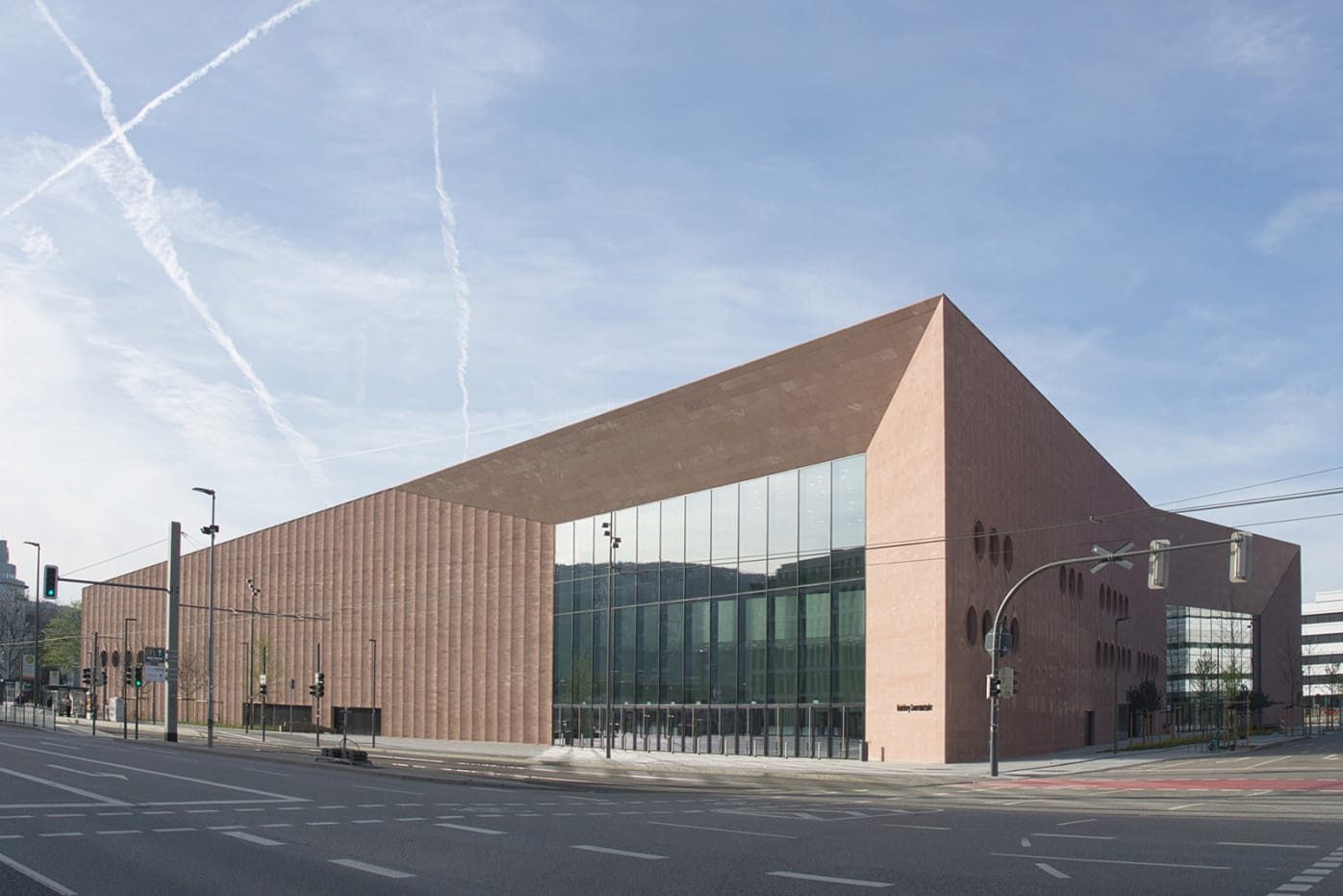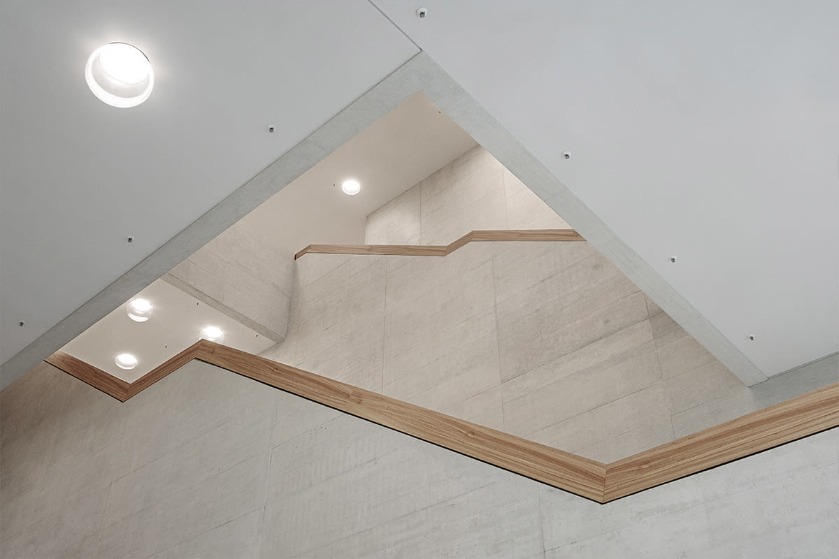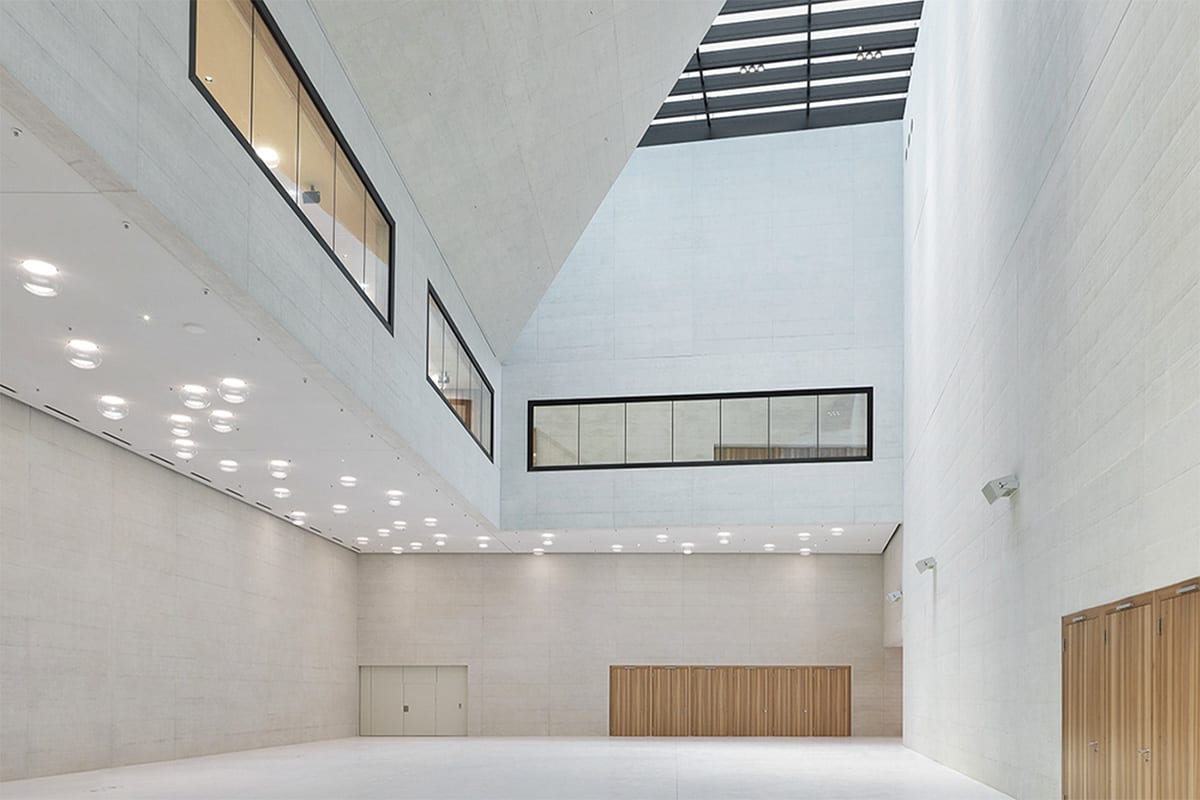 Das von den Degelo Architekten entworfene Gebäude besticht durch seine kompakte, fensterarme Außenstruktur, während das Innere mit lichtdurchfluteten, nahezu entmaterialisierten Räumen überrascht. Das fast 20 Meter hohe, von Zenitlicht durchflutete Foyer und der gebäudehohe imposante „Große Saal“ verdeutlichen diesen Kontrast und bilden das Herzstück des Raumkonzepts.